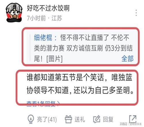 京苏战“潜力赛”的各种乱象,赛后也遭到网友们的一致诟病。“笑死人 篮协这水平还不如足协”;“滑天下之大稽”;“怪不得不让直播了 不伦不类的潜力赛 双方诚信互刷 仍3分到结尾!”;“谁都知道第五节是个笑话,唯独篮协领导不知道,还以为自己多圣明”;“笑死我了哈哈哈哈哈哈。”……
