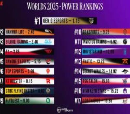 外媒发布战队排名:GEN、HLE、BLG、T1前四TES、IG第6、11